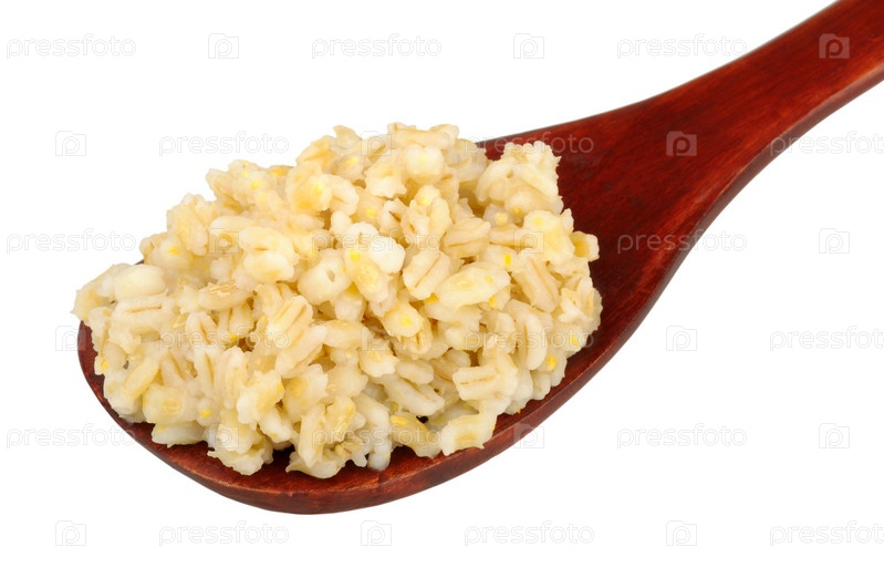 Вареная перловая крупа в деревянной ложке на белом фоне