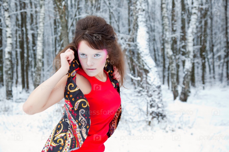 Портрет красивой модели с ярким макияжем в лесу