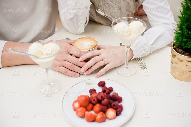 Руки влюбленных на чашке кофе в форме сердца
