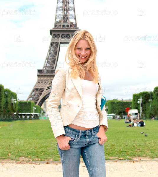 Отдых в Париже. Счастливая девушка рядом с Эйфелевой башней