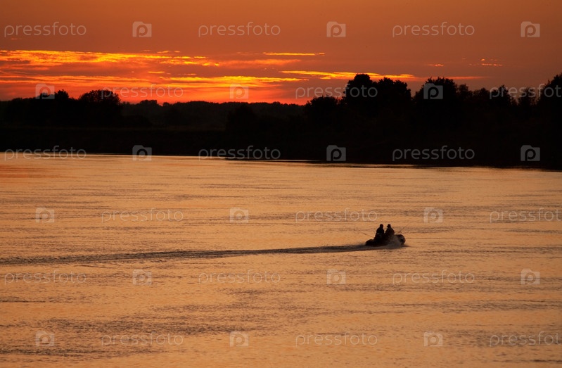 Рыбаки с удочками в резиновой лодке, плывущей по реке на закате