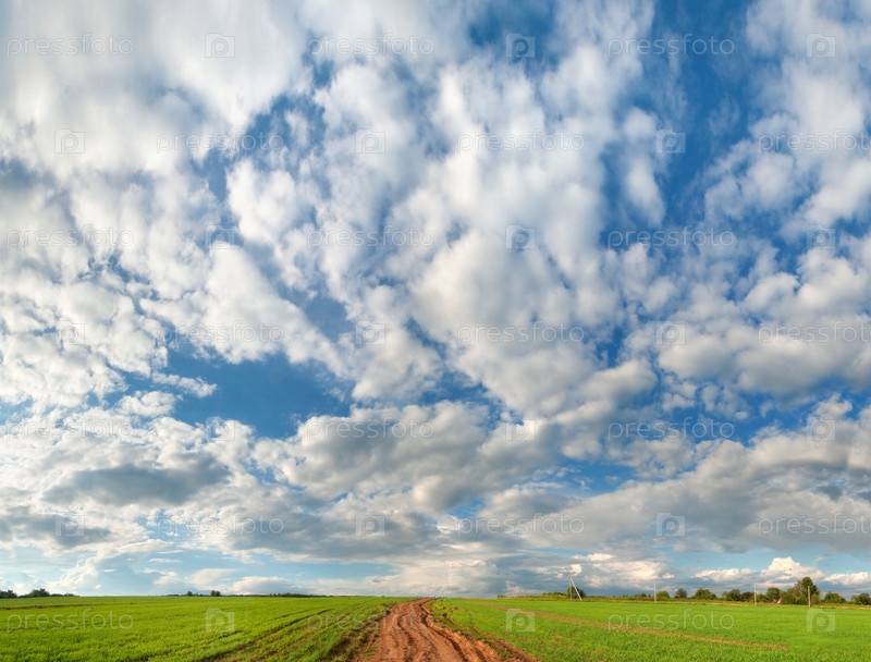 Русский пейзаж с грунтовой дорогой и высоким облачным синим небом
