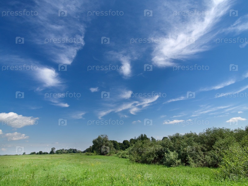 Русский пейзаж с зеленым полем и глубоким синим небом с прожилками облаков