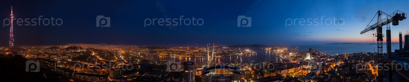 Владивосток, Россия. Вечерняя панорама города. Подготовка к саммиту АТЭС. Завершающая фаза строительства моста через бухту Золотой рог. 29 мая 2012 года