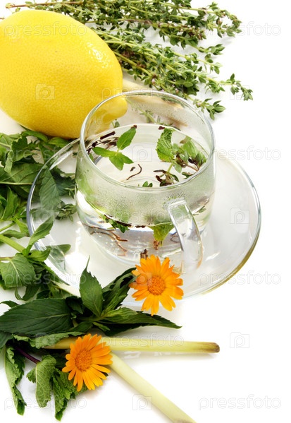 Чашка с травами и лимоном на белом фоне