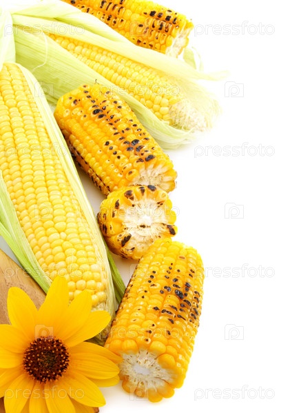 Цветок, жареная кукуруза и свежие початки с зелеными листьями на белом фоне