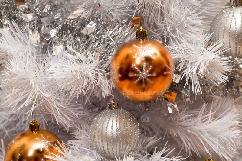 Близкий план игрушечных шаров, висящих на белой пушистой ветви искусственной елки