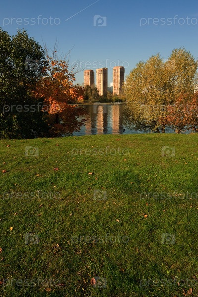 Вид на три многоэтажных дома с парка