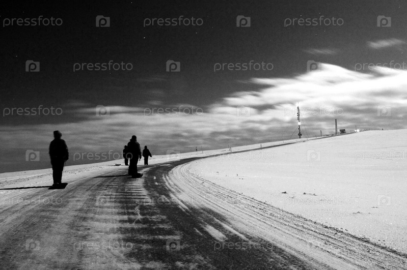 Люди, поднимающиеся на возвышенность ночью