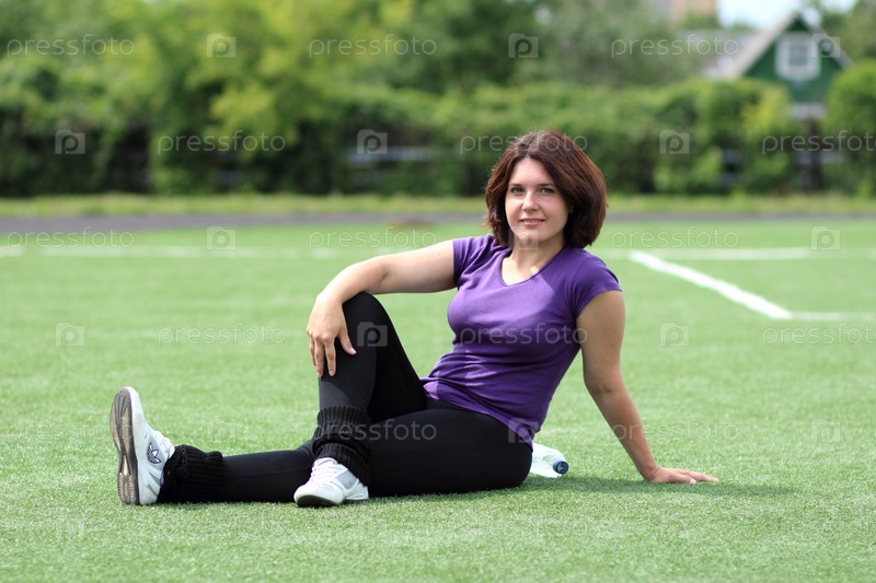 Красивая спортивная женщина сидит на стадионе