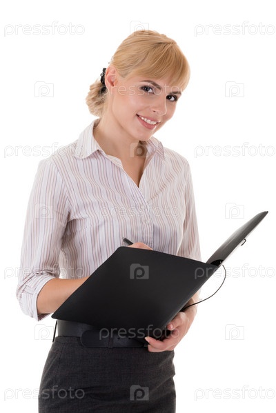 Женщина-интервьюер с папкой на белом фоне