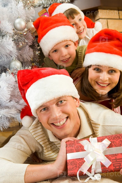 Портрет счастливого мужчины в Санта-Капе, держащего коробку с подарками со своей семьей на заднем плане