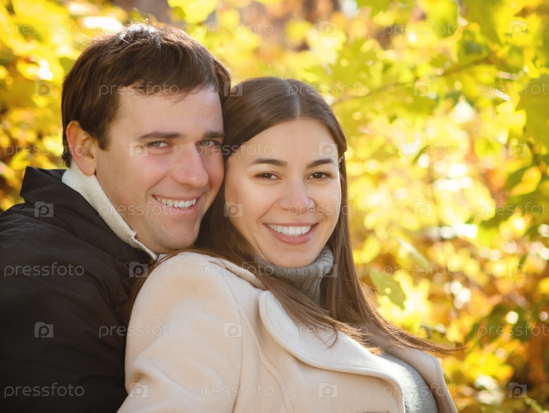 Счастливая женщина и мужчина в осеннем лесу