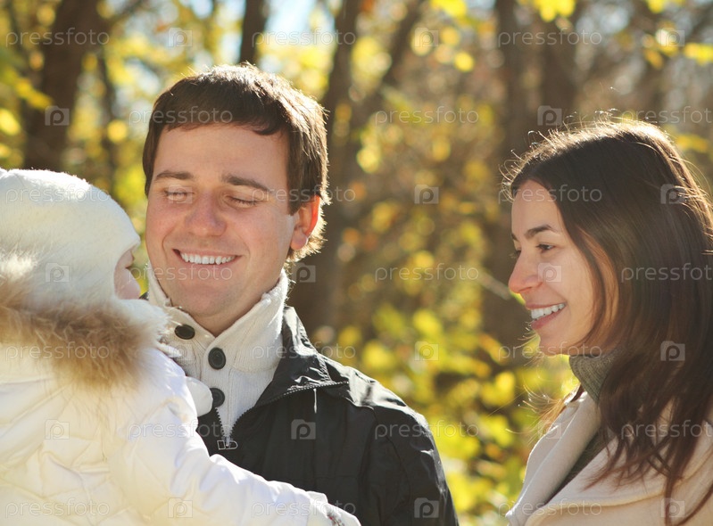 Молодая семья с маленькой дочкой в осеннем парке