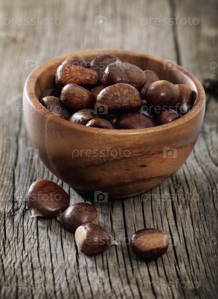 Жареные каштаны в миске на деревянном фоне