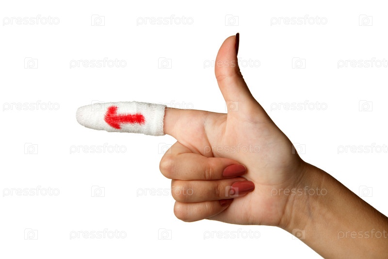 Палец в повязке с нарисованной красной стрелкой на белом фоне