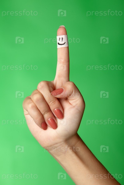 Палец в повязке с нарисованным смайлом на зеленом фоне