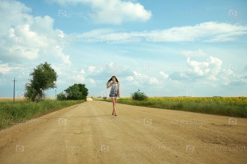 Молодая девушка на дороге среди полей