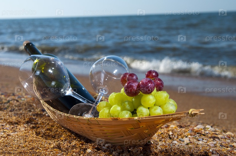 Вино, бокалы и виноград в корзине на пляже