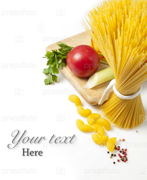 Итальянские макароны с помидорами, луком и петрушкой на белом фоне с пространством для текста