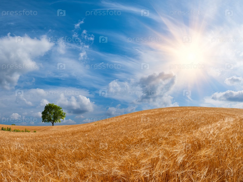 Поле пшеницы с деревом на горизонте