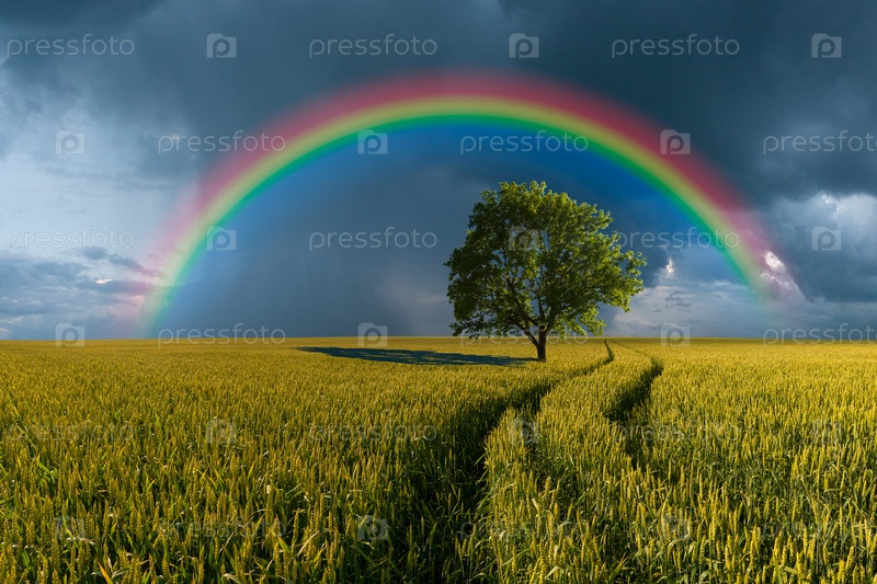 Летний пейзаж с дорогой и одиноким деревом на пшеничном поле во время дождя