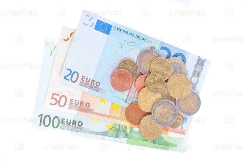 Различные банкноты и монеты евро, изолированные на белом фоне