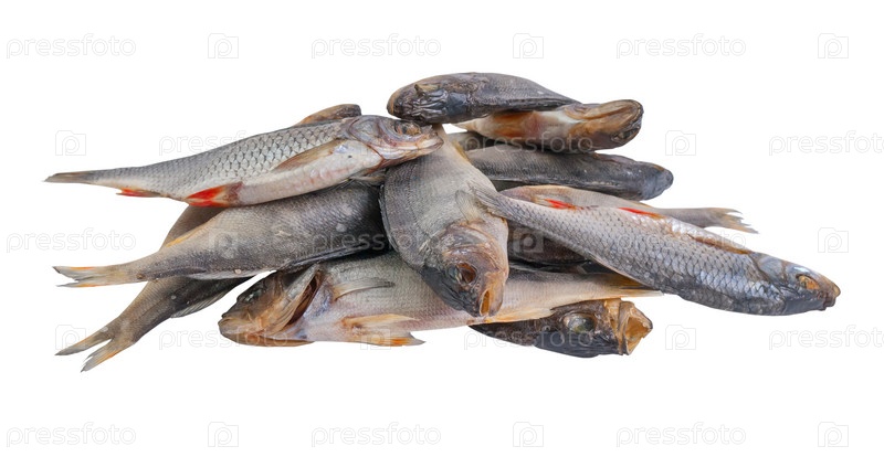 Сушеная соленая рыба как закуска к пиву, изолированная на белом фоне