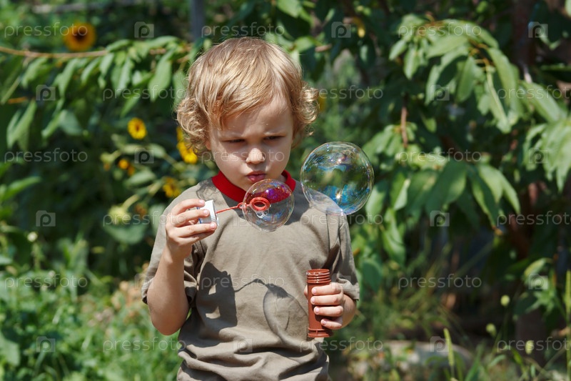 Мальчик пускает мыльные пузыри в солнечный день