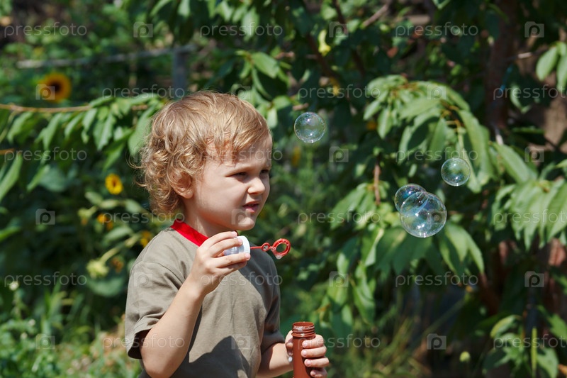 Мальчик пускает мыльные пузыри в солнечный день