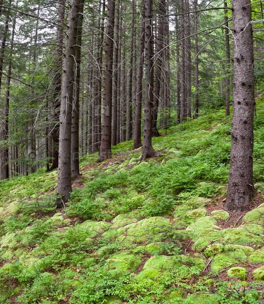 Хвойный лес и мох на склонах Карпат
