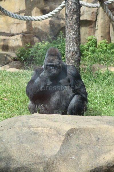 Горилла сидит на траве в зоопарке
