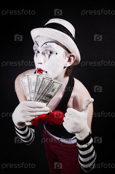 Театральный мим с долларами в руках на черном фоне