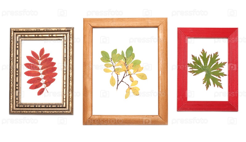 Сухие листья, в деревянной рамке для фотографий
