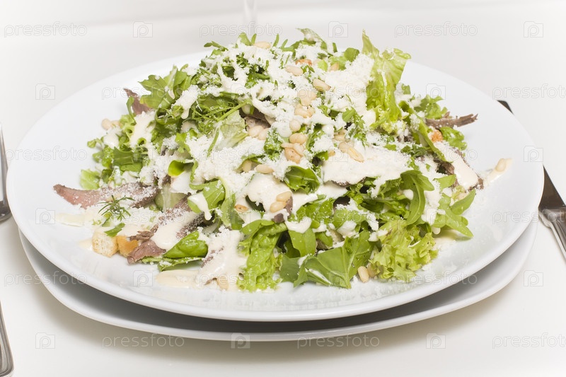 Салат с мясом и сыром на столе в ресторане