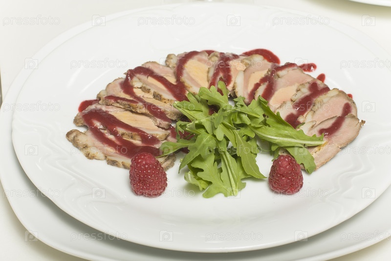 Нарезка из свинины с малиновым соусом на тарелке крупным планом