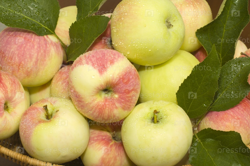 Яблоки с зелеными листьями