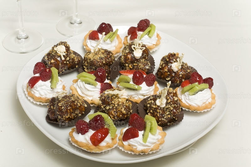 Пирожные с ягодами и фруктами на тарелке крупным планом