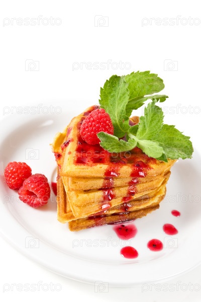Бельгийские вафли с малиной, мятой и джемом на тарелке