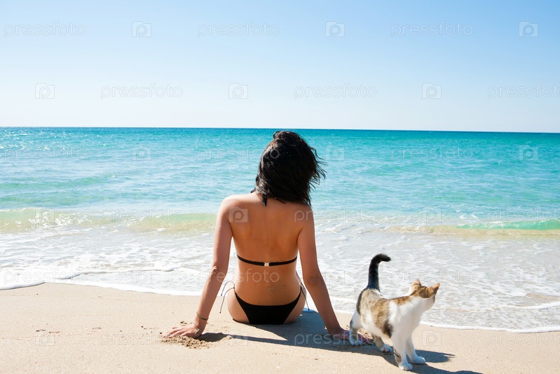 Девушка на пляже с котенком