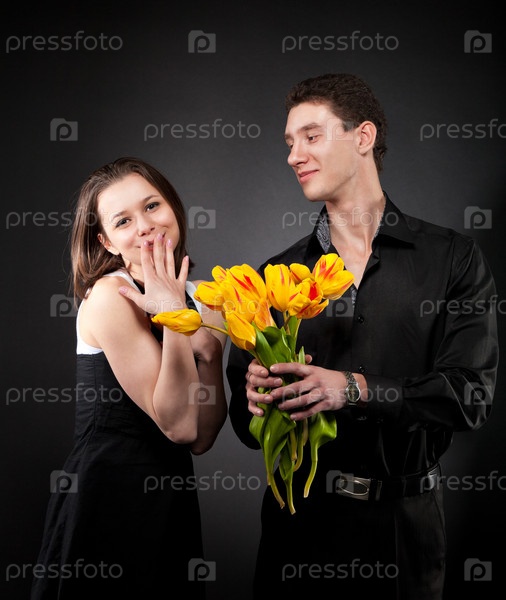Портрет молодой влюбленной пары с цветами на темном фоне