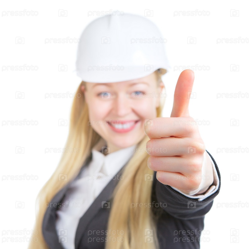 Женщина-инженер с поднятым большим пальцем, изолированная на белом