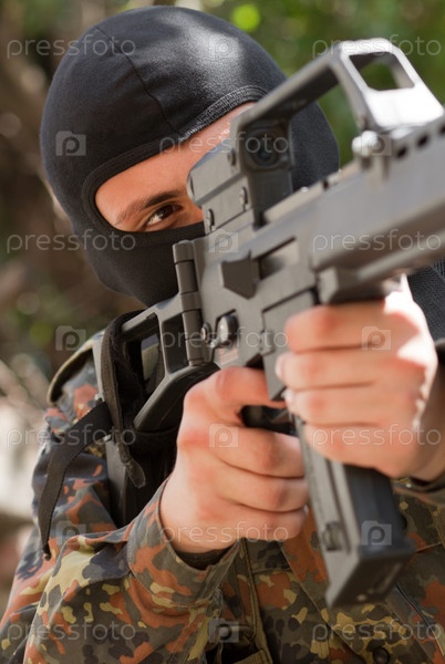 Вооруженный и опасный человек в черной маске целится в оптический прицел