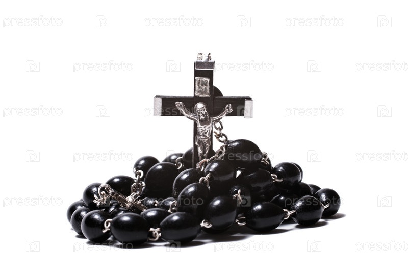 Католические четки с распятием, изолированные на белом фоне крупным планом