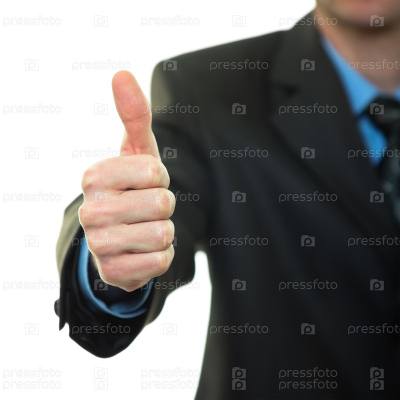 Бизнесмен показывает жест с поднятым большим пальцем на белом фоне