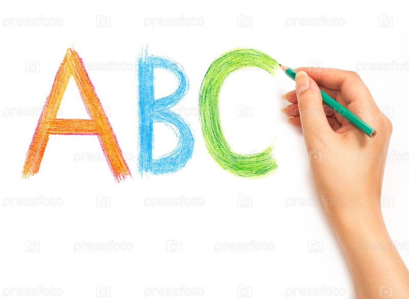 Женская рука пишет буквы ABC карандашом на белом фоне