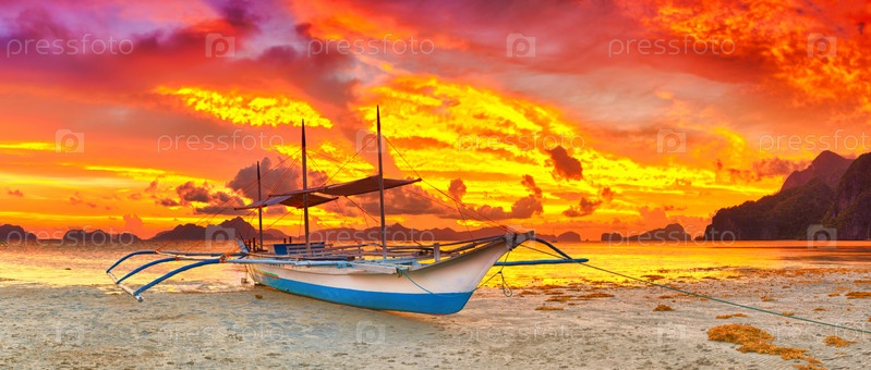 Традиционная филиппинская лодка в лагуне на закате