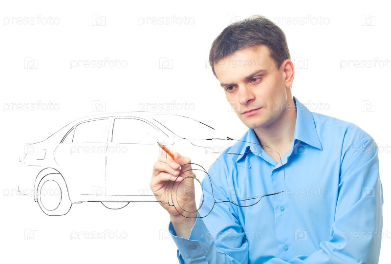 Мужчина рисует автомобиль, изолированный на белом фоне