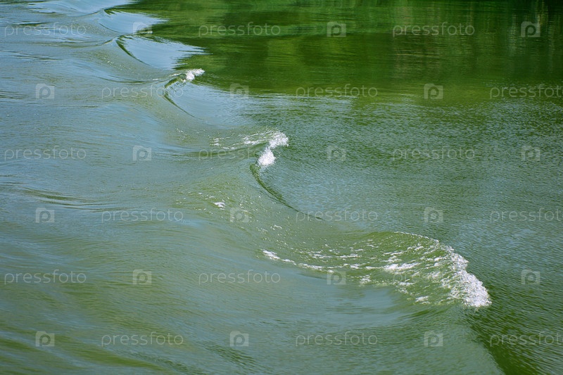 Поверхность воды в реке, красивые бегущие волны и отражение зеленых деревьев