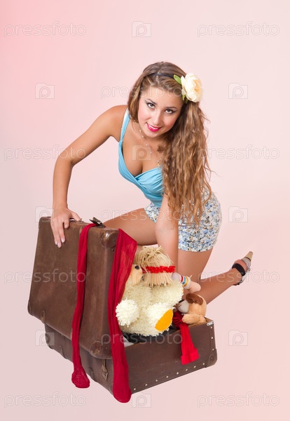 Молодая путешественница в стиле пин-ап закрывает чемодан на розовом фоне